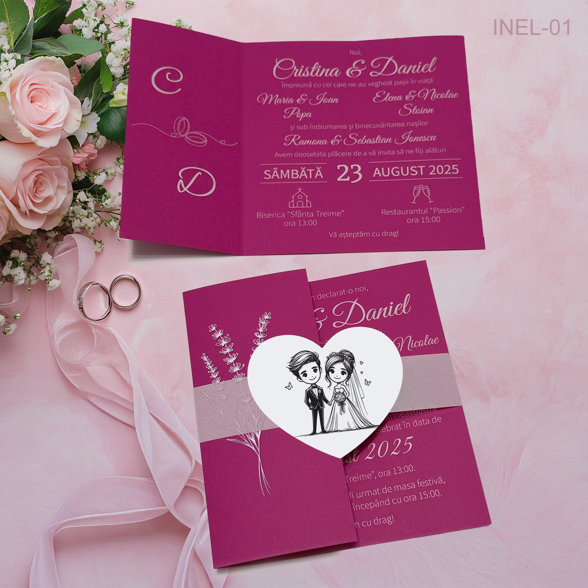 👉 Include: invitație pliabilă + bandă decorativă + etichetă în formă de inimă