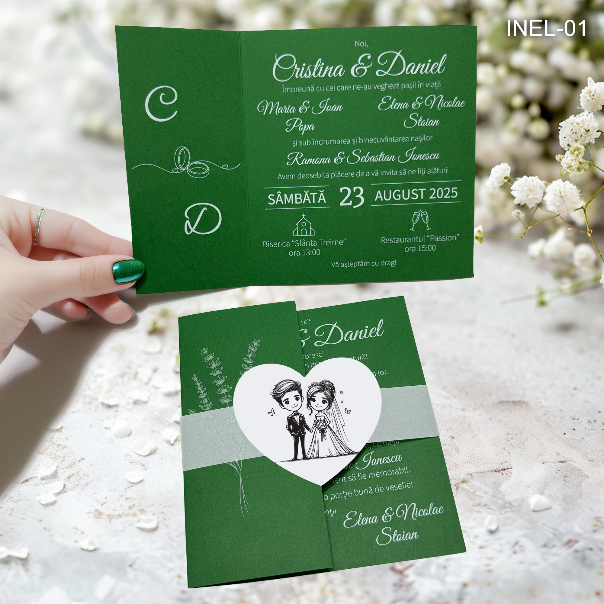 🌿 Propusă pentru cupluri care își doresc o invitație cu un impact vizual puternic, dar cu o eleganță discretă.