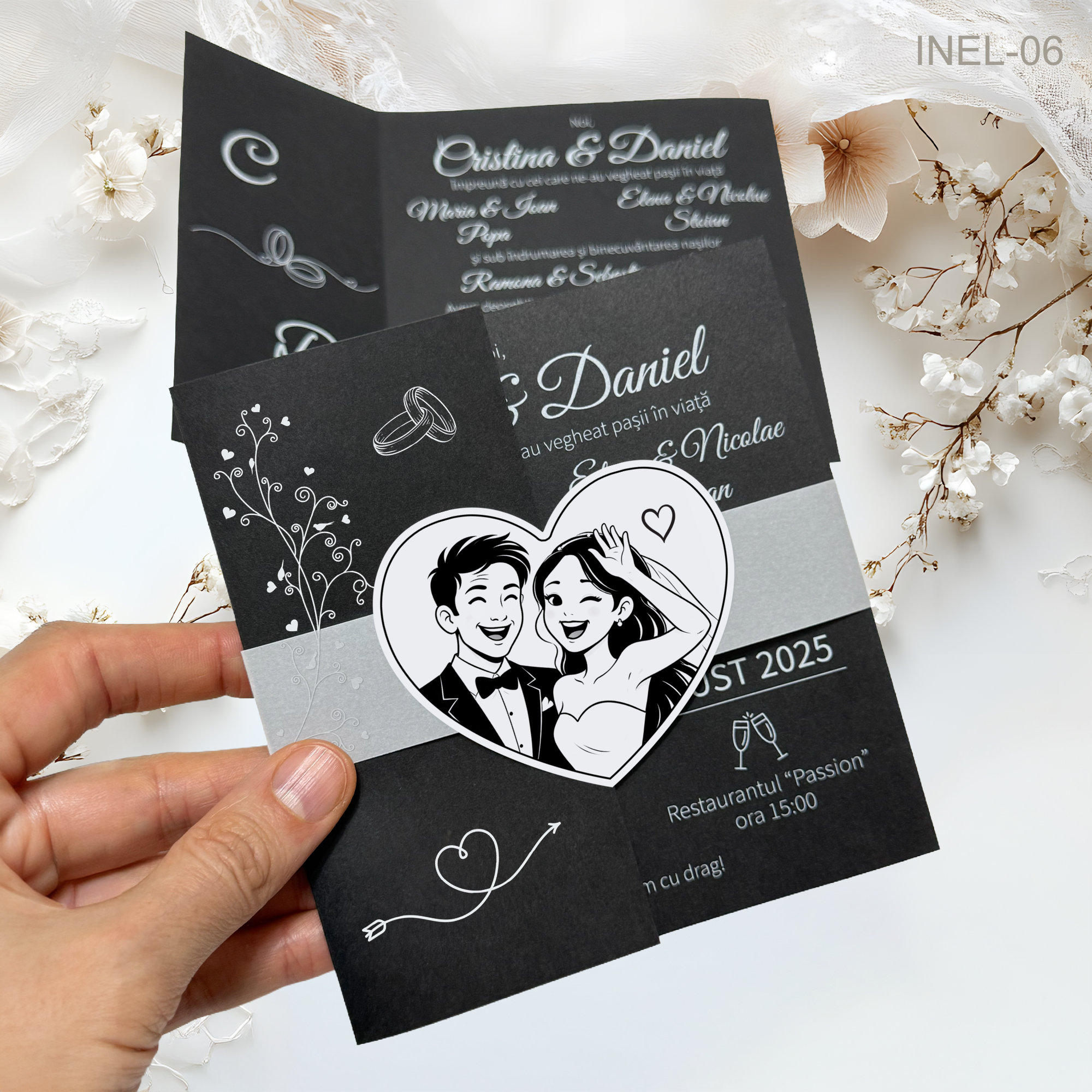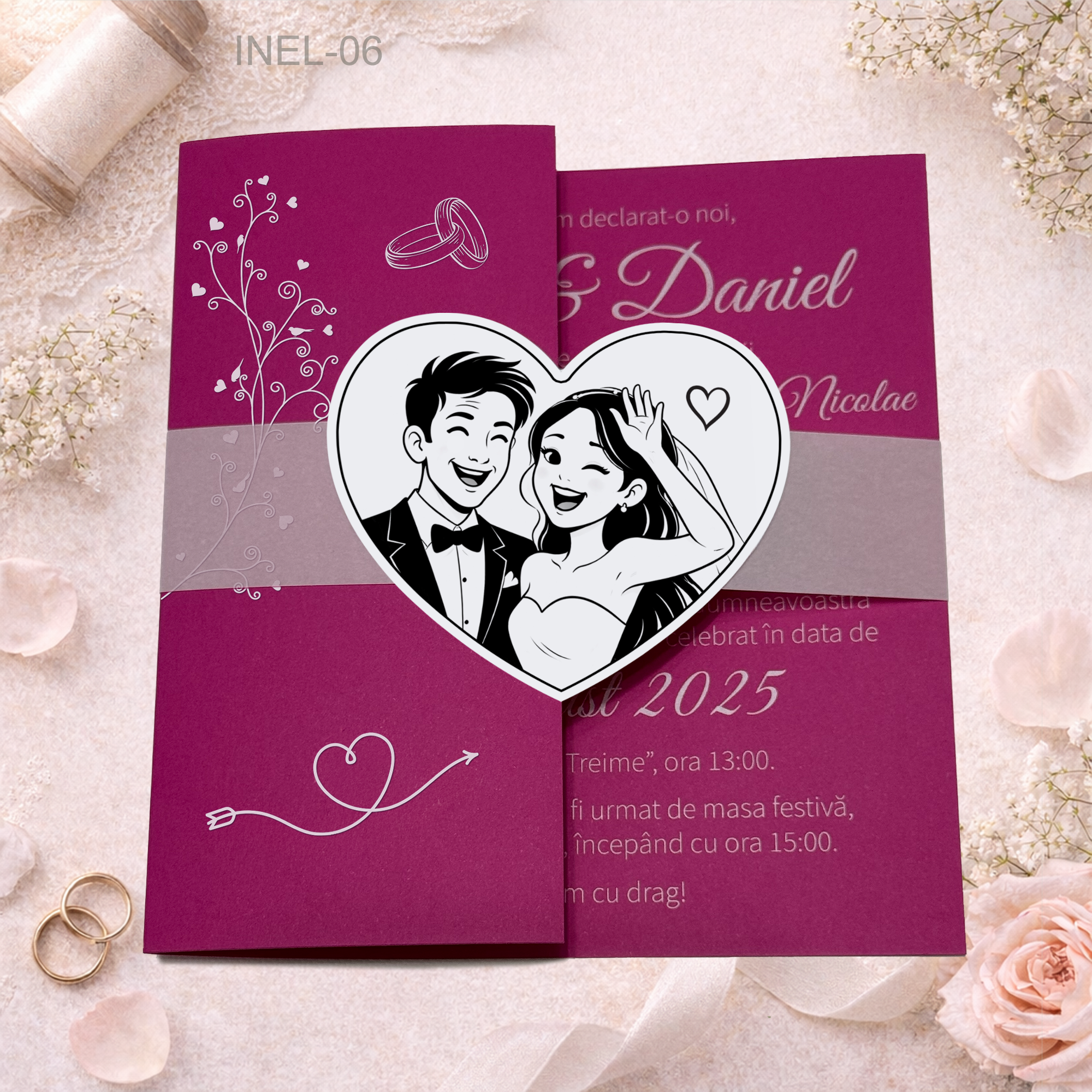 👉 Include: invitație pliabilă + bandă decorativă + etichetă în formă de inimă