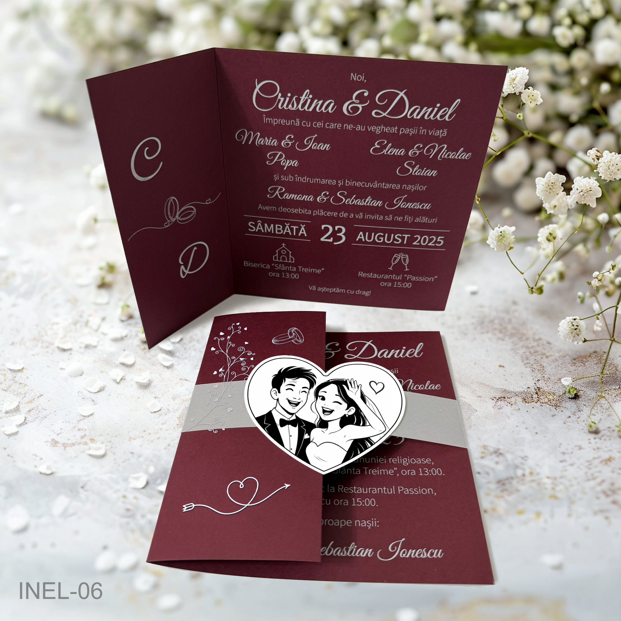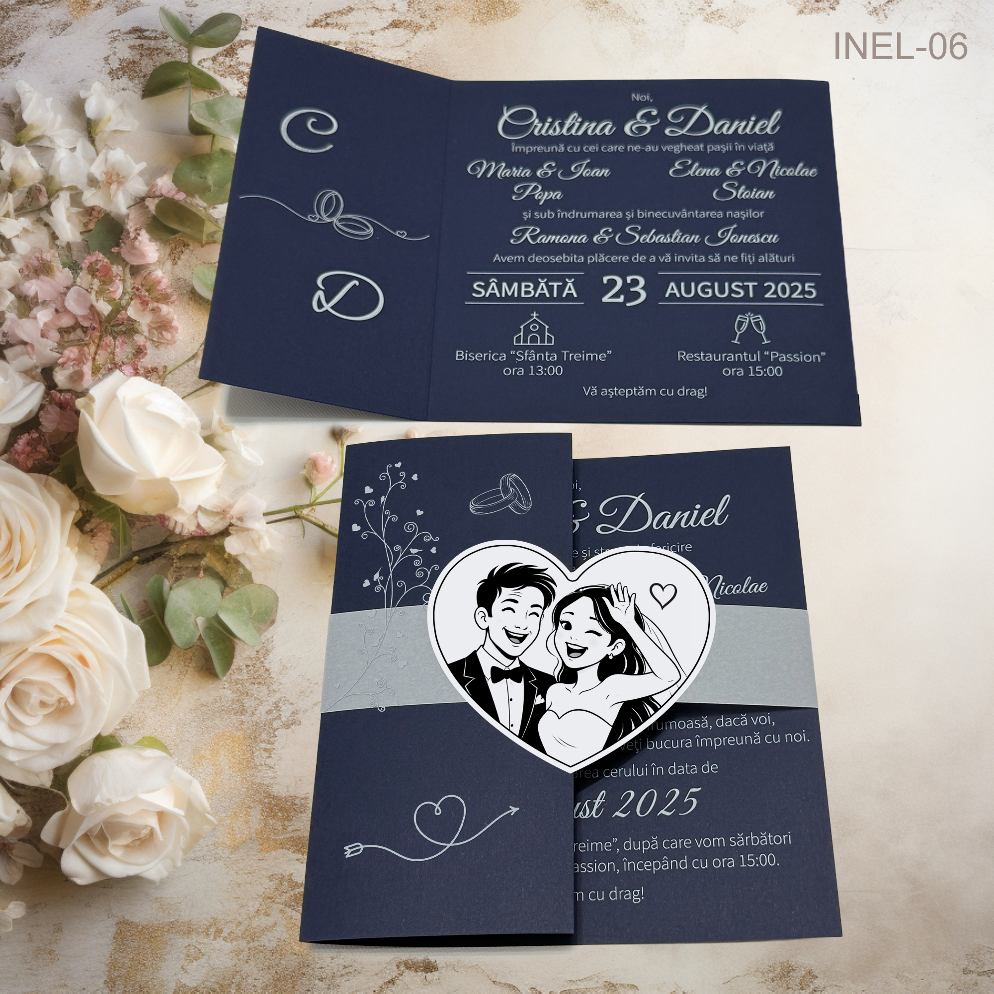 Designul impresionează prin combinația perfectă între simplitate și sofisticare. Invitația este realizată pe un carton de calitate premium, într-un ton profund și elegant, pus în valoare de un print delicat alb și elemente grafice romantice.