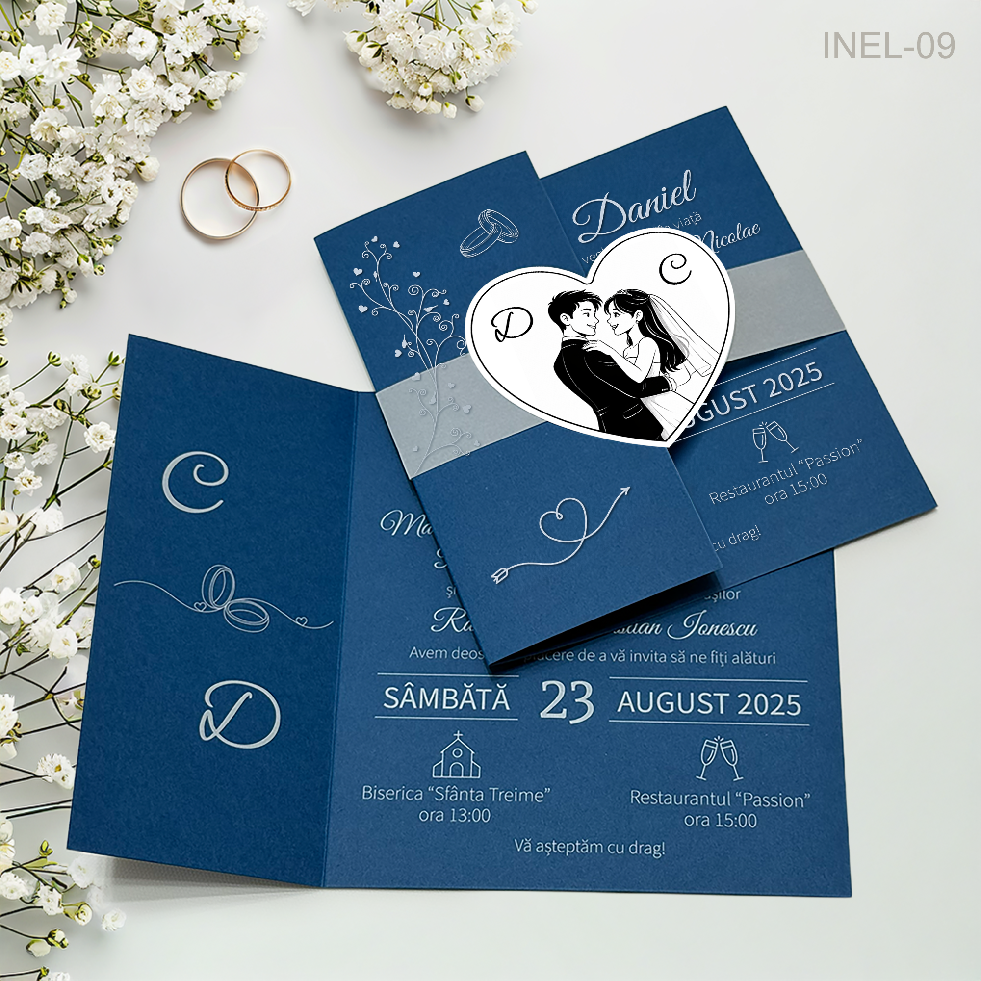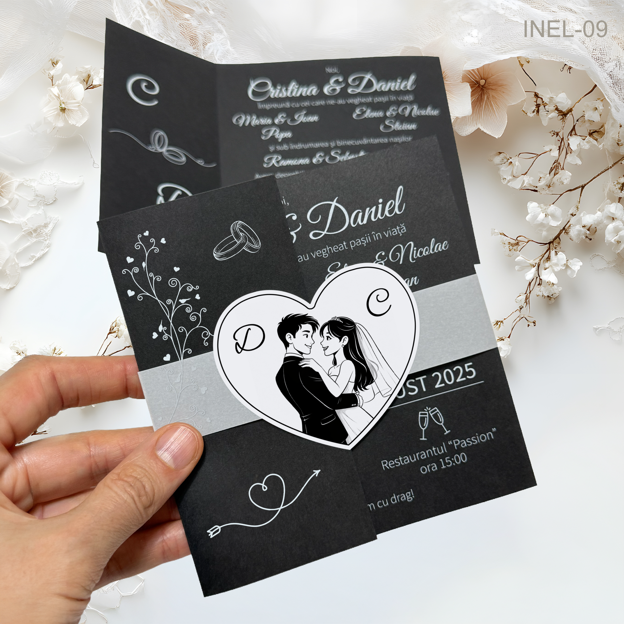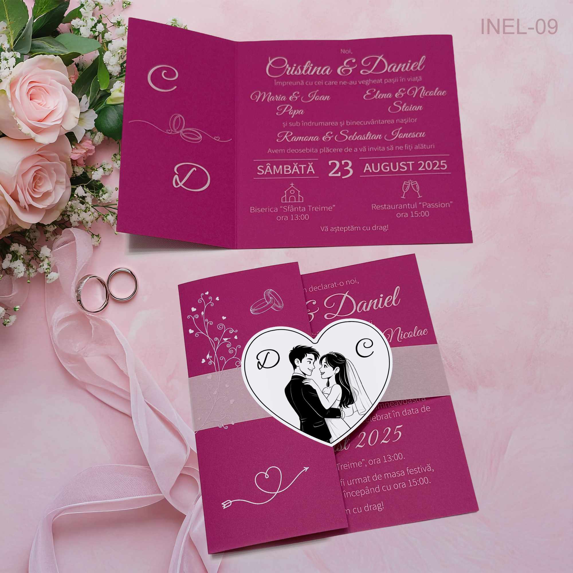 👉 Include: invitație pliabilă + bandă decorativă + etichetă în formă de inimă