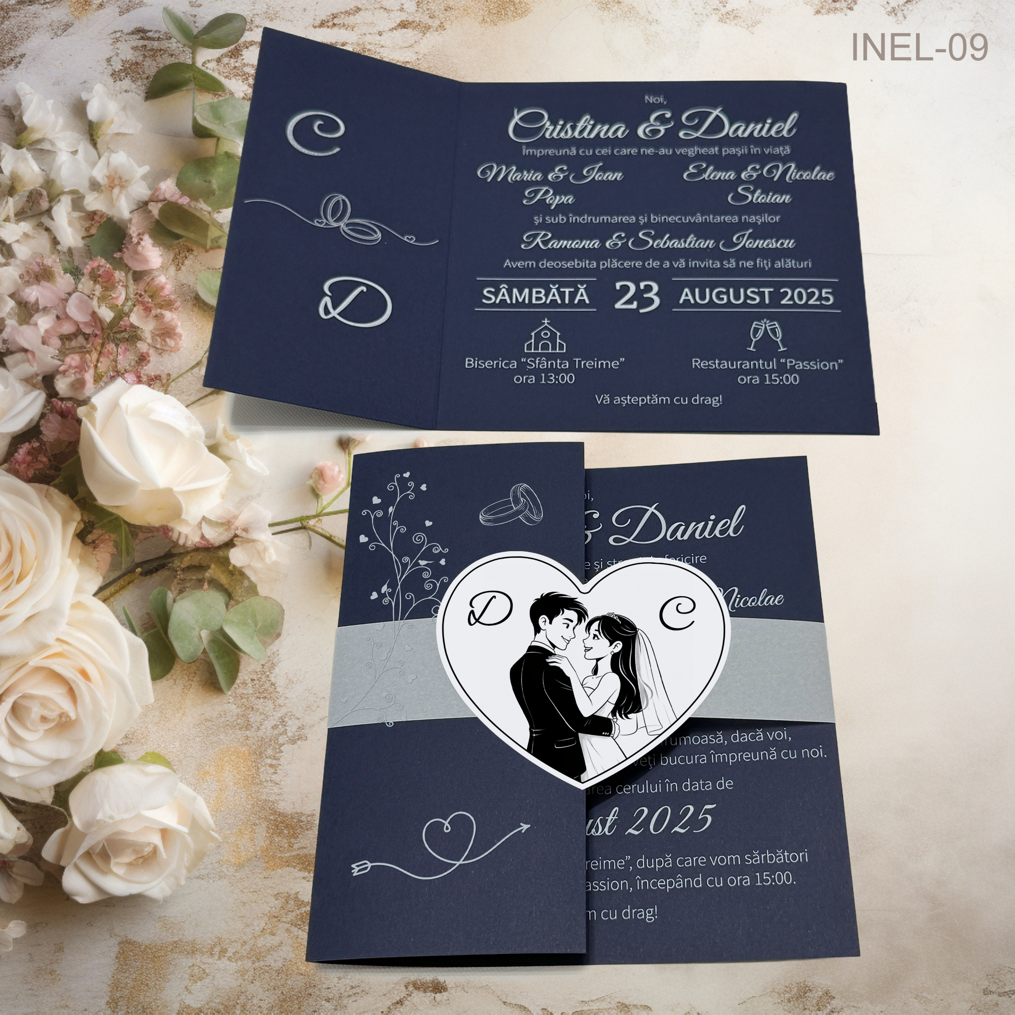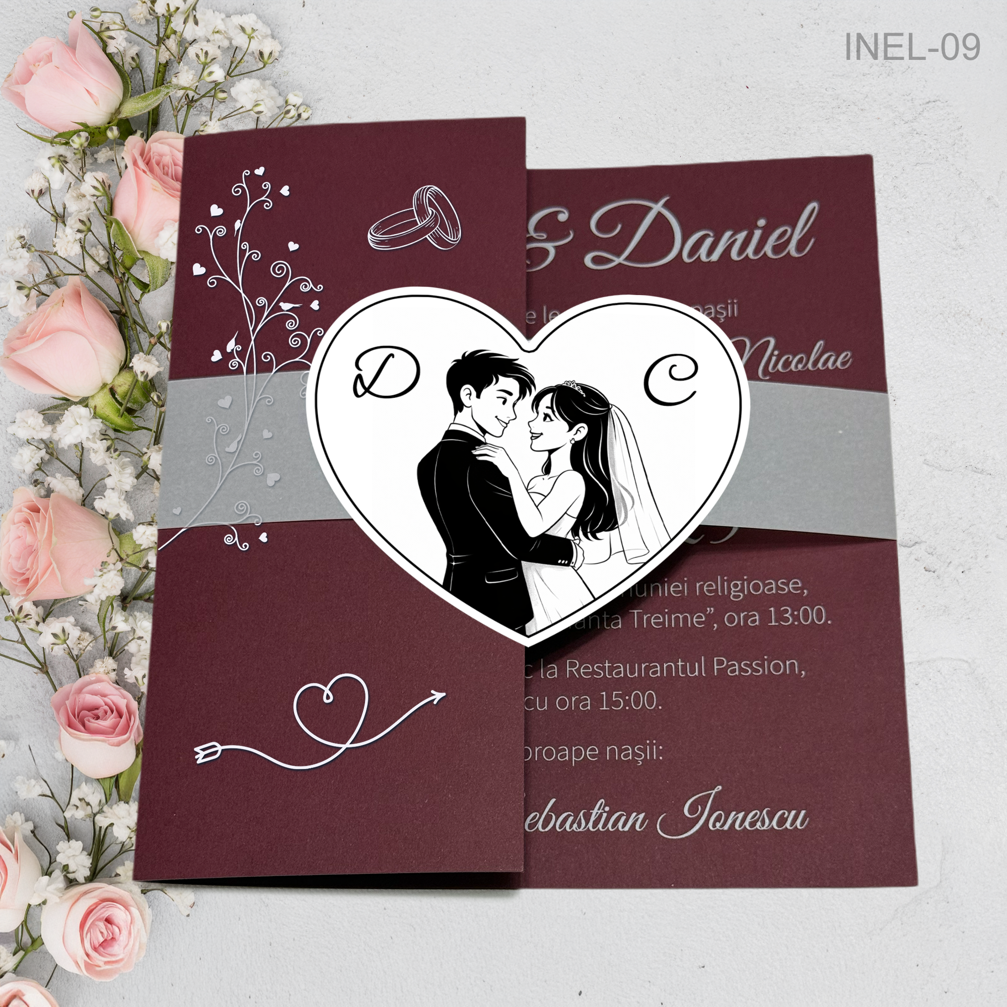 Designul impresionează prin combinația perfectă între simplitate și sofisticare. Invitația este realizată pe un carton de calitate premium, într-un ton profund și elegant, pus în valoare de un print delicat alb și elemente grafice romantice.