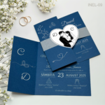 Invitațiile au format pliabil, beneficiază de tipar de înaltă calitate și sunt accesorizate cu panglică și etichetă decorativă.