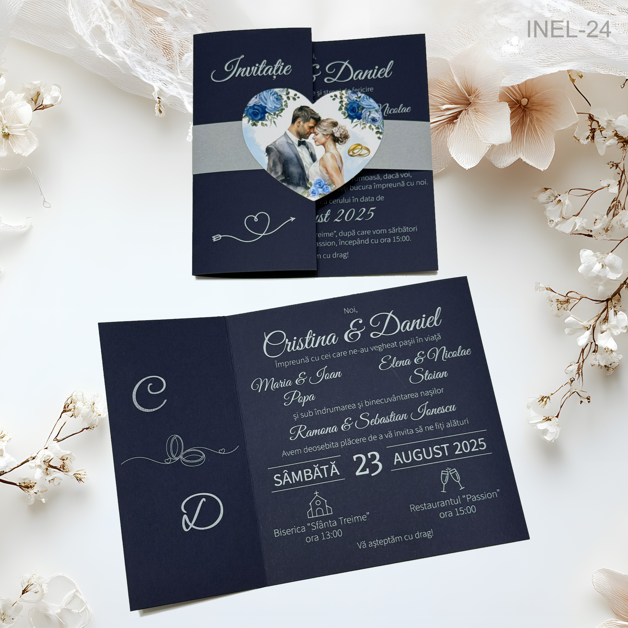 Designul impresionează prin combinația perfectă între simplitate și sofisticare. Invitația este realizată pe un carton de calitate premium, într-un ton profund și elegant, pus în valoare de un print delicat alb și elemente grafice romantice.